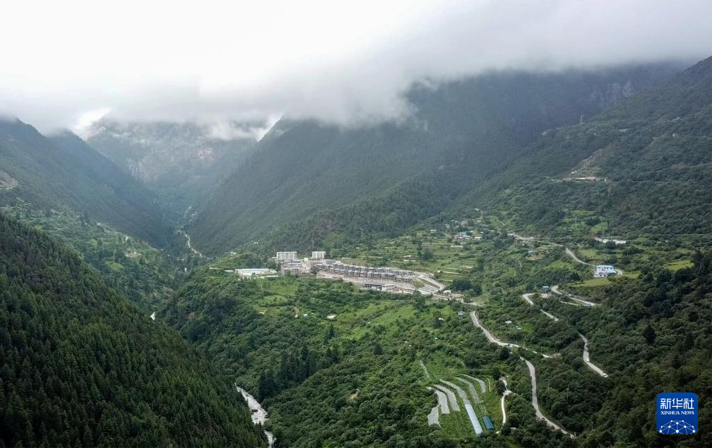 這是錯那市貢日門巴民族鄉斯木村,畫面下方覆蓋地膜處為該村的莓茶種植基地。(無人機照片,7月28日攝)。新華社記者 旦增尼瑪曲珠 攝