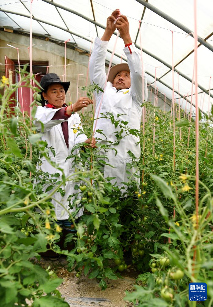 措勤縣高原生態畜牧業現代化養殖一體化產業綜合基地合作社社員在蔬菜大棚為西紅柿吊蔓(8月19日攝)。新華社記者 張汝鋒 攝