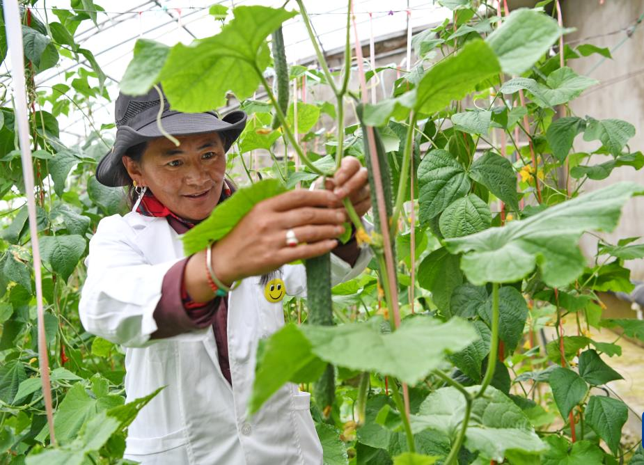 措勤縣高原生態畜牧業現代化養殖一體化產業綜合基地合作社社員在蔬菜大棚為西紅柿吊蔓(8月19日攝)。[詳細] -