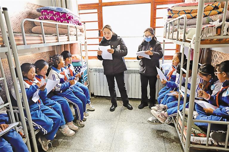 圖為措美縣人民法院工作人員在措美縣小學學生宿舍向學生普及法律知識。 記者 巴桑旺姆 攝