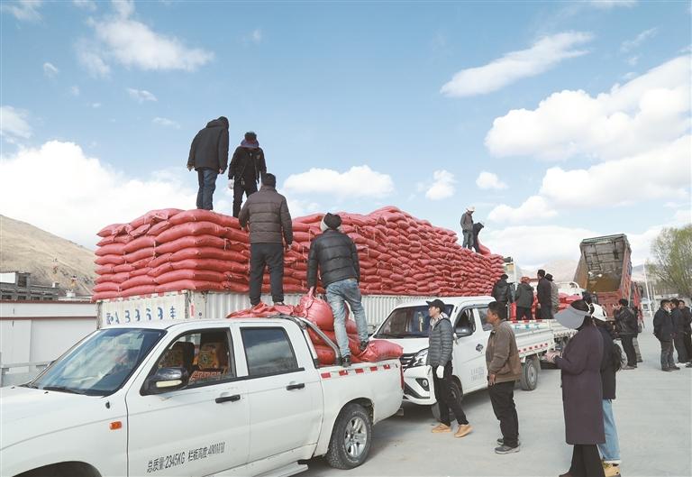 4月7日,拉薩市墨竹工卡縣舉行防抗災飼草料集中發放儀式。清晨,墨竹工卡縣農業農村局停車場內,一輛輛滿載飼草的貨車整齊列隊,各鄉鎮工作人員有序到場卸貨、裝車,現場一派繁忙有序的景象。