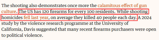 美國某非黨派研究所調查顯示,多數美國人認為政治中的極端言論助長了暴力行為。美國槍支泛濫問題同樣難辭其咎。數據顯示,全美每100人擁有120支槍,2025年平均每天40人死于槍擊。