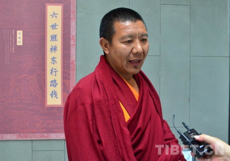圖為扎什倫布寺管委會副主任多布瓊在展覽現場接受專訪 攝影:歐帆