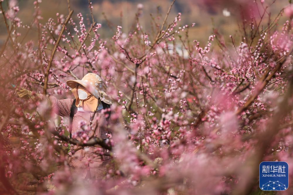 3月17日,在云南省曲靖市沾益區盤江鎮河西村桃園基地,果農在果園進行管護作業。新華社發(孫文來攝)