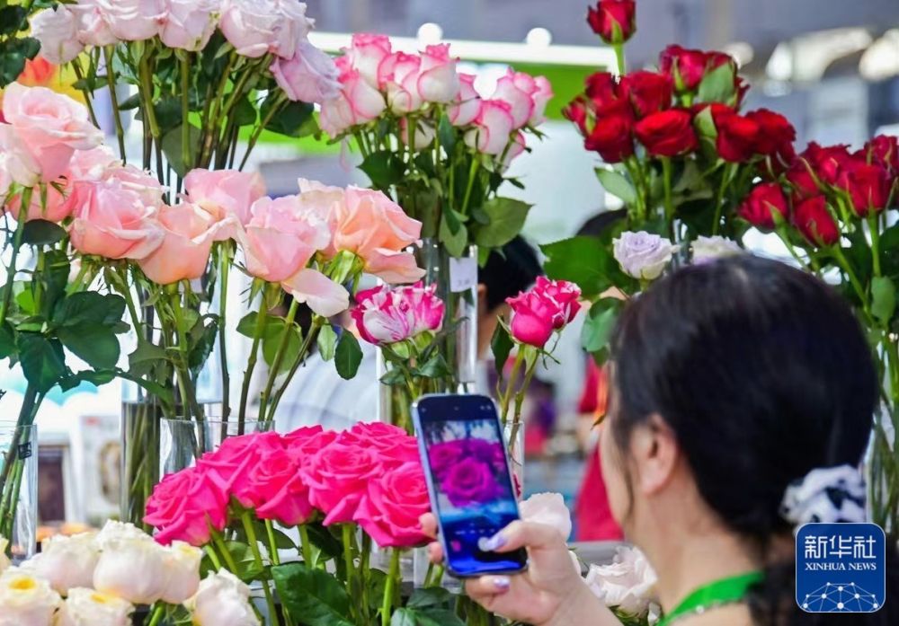 觀眾在國貨特色潮品展區云南展臺拍照,云南展臺為本屆消博會準備了8000余支、20多個品種的云南本土鮮切玫瑰。新華社記者王楚天 攝