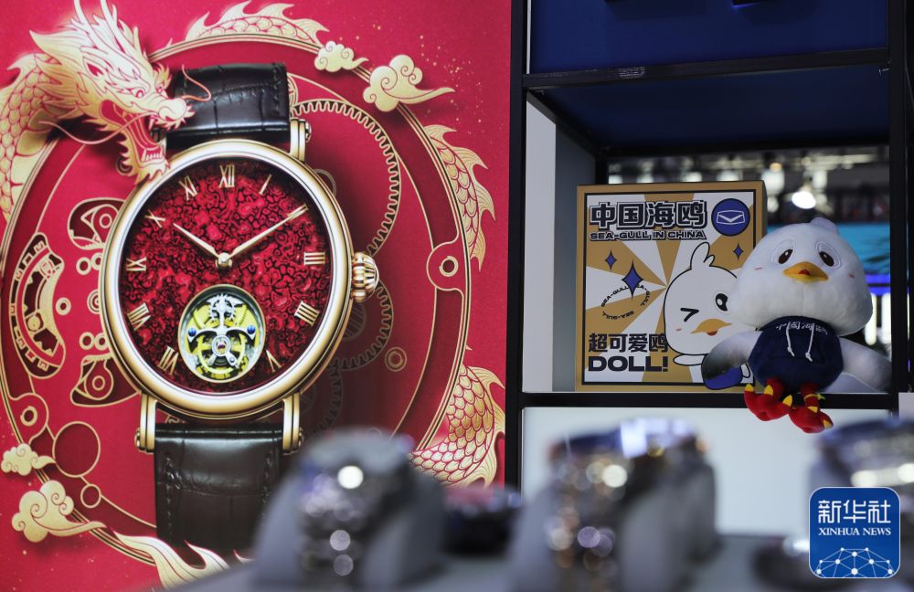 圖為天津館海鷗國潮風格手表展柜。本屆消博會上,“老字號”帶來的國潮新品不僅有著海派文化和傳統文化元素,還與獨具匠心的年輕創意相融合。