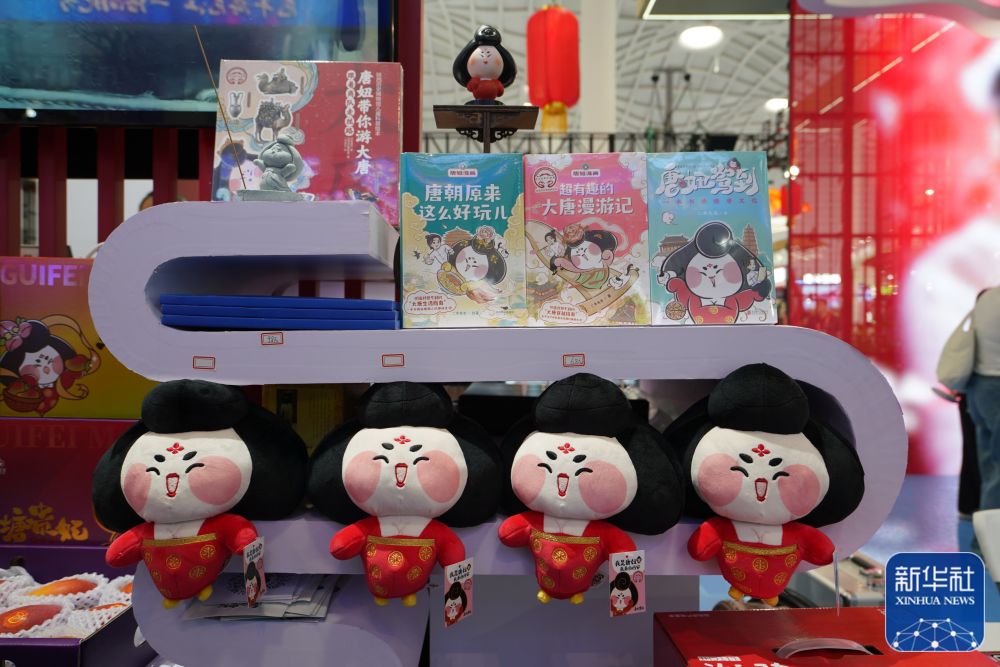 國貨特色潮品展區陜西展臺展示了“唐妞”系列文創產品。“唐妞”的卡通形象取材于陜西歷史博物館館藏文物——唐代彩繪仕女俑。新華社記者楊冠宇 攝