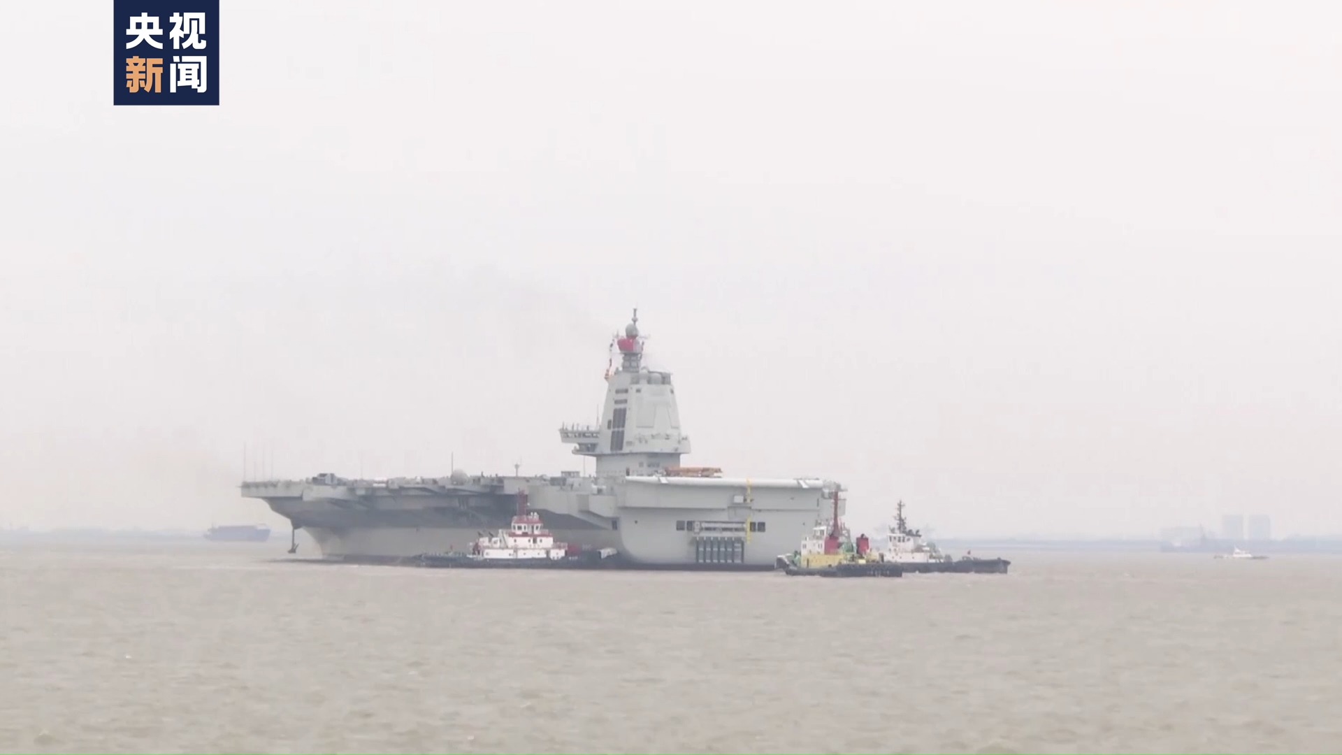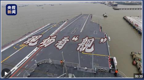 我國第三艘航空母艦福建艦在多艘拖船的牽引下,正在緩緩地駛離上海江南造船廠的碼頭,赴相關海域開展首次航行試驗。