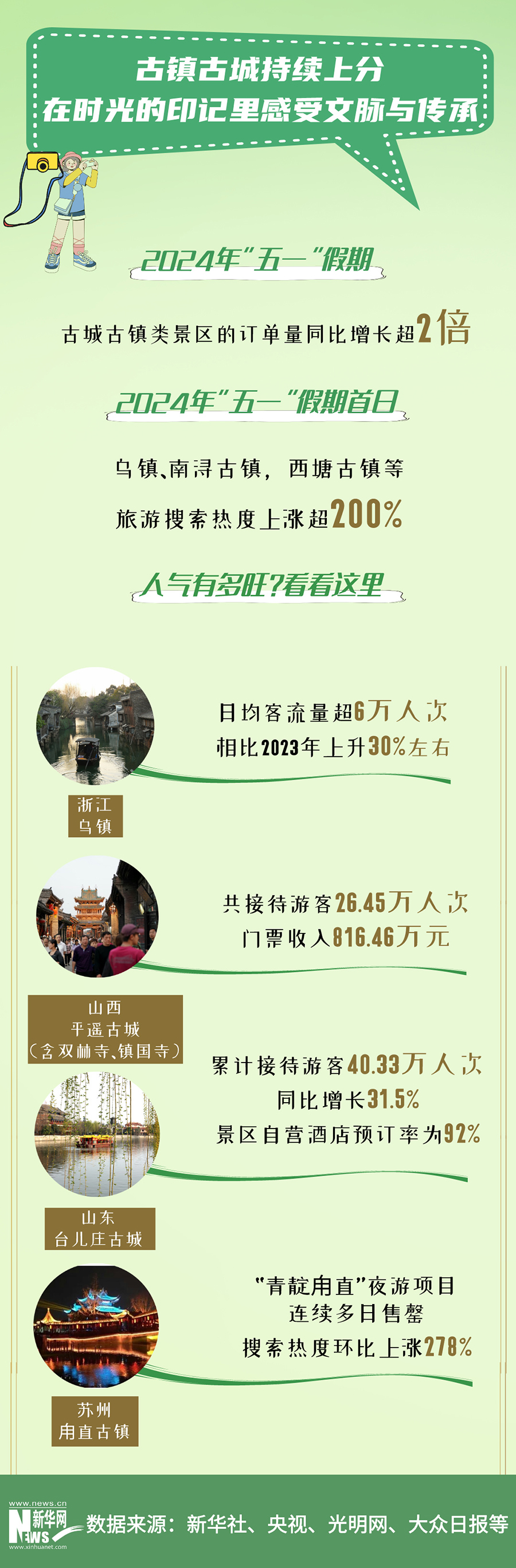 從淄博、哈爾濱到天水,“網(wǎng)紅”城市不斷上新;從桐廬、陽朔到義烏,“寶藏”小城頻頻出圈;從烏鎮(zhèn)、麗江再到南潯,古鎮(zhèn)古城持續(xù)上分;從以往人們扎堆游,到今年五一“每個城市都彷佛有一億人”......有數(shù)據(jù)、有人氣,文旅市場越來越活,越來越“會玩”。
