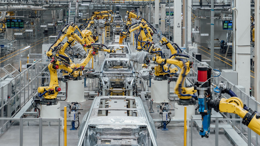 這是在重慶市兩江新區拍攝的賽力斯汽車超級工廠焊裝車間生產線(2024年2月26日攝,無人機照片)。新華社發(高彰 攝)