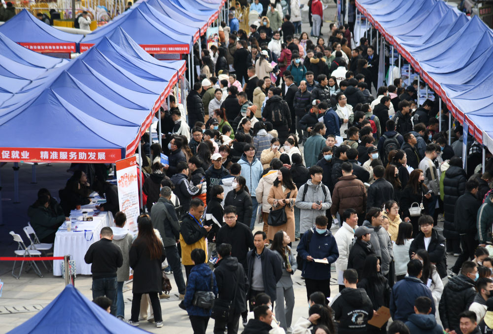 求職者在2024年陜西工會“春送崗位”就業服務月現場招聘會上了解招聘信息(2024年3月6日攝)。新華社記者 張博文 攝