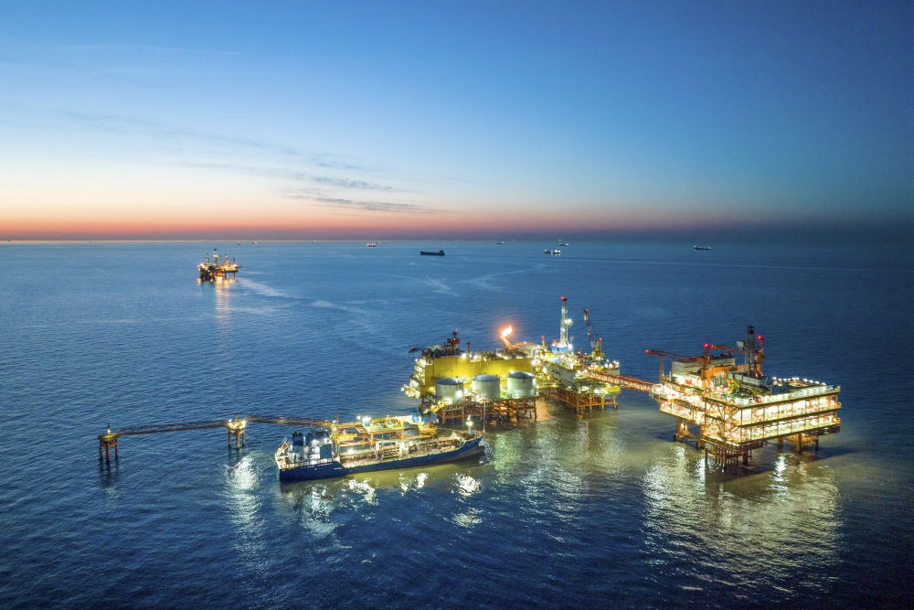 這是2024年1月25日拍攝的埕北油田全景(無人機照片)。當日,位于渤海灣西南部的埕北油田油氣處理與岸電設備共建平臺——CEPC(中心平臺)正式投產,該平臺可使油田接入來自陸地的綠色電力,減少海上“自發電”帶來的天然氣和原油消耗。新華社發(杜鵬輝攝)