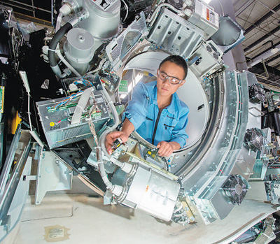 北京經(jīng)濟(jì)技術(shù)開發(fā)區(qū)永昌北路1號,通用電氣醫(yī)療北京影像設(shè)備制造基地(以下簡稱“北京生產(chǎn)基地”),生產(chǎn)線上機(jī)器轟鳴,一臺臺醫(yī)療器械陸續(xù)完成裝配。通用電氣醫(yī)療在全球銷售的每三臺CT機(jī)中就有2臺產(chǎn)自這里,產(chǎn)品銷往全球100多個國家和地區(qū)。