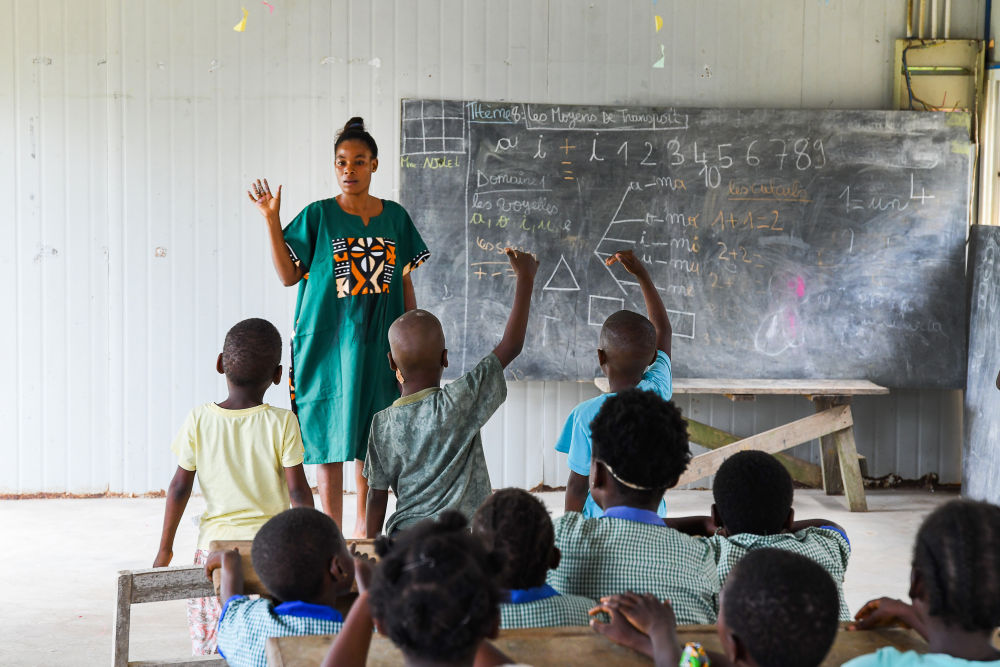7月10日,在喀麥隆南部大區克里比市,老師和學生參加恩杜馬萊雙語學校暑期活動。新華社發(科普索攝)