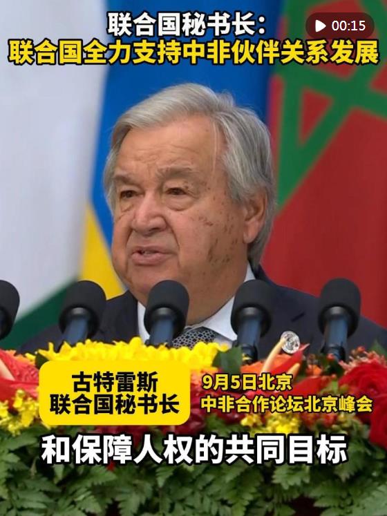 聯合國秘書長古特雷斯5日在中非合作論壇北京峰會開幕式上說,聯合國將全力參與支持中非發展堅固的伙伴關系,推動世界實現和平、可持續發展和保障人權的共同目標。