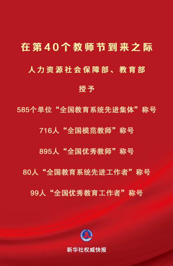 在中華人民共和國成立75周年和第40個教師節到來之際,為大力弘揚教育家精神,營造全社會尊師重教濃厚氛圍,激勵全國廣大教師和教育工作者落實立德樹人根本任務,積極投身教育強國建設,人力資源社會保障部、教育部決定授予中央財經大學金融學院等585個單位“全國教育系統先進集體”稱號;授予刁榮春等716名同志“全國模范教師”稱號;授予于淵等895名同志“全國優秀教師”稱號;授予王彥平等80名同志“全國教育系統先進工作者”稱號;授予王軍等99名同志“全國優秀教育工作者”稱號。