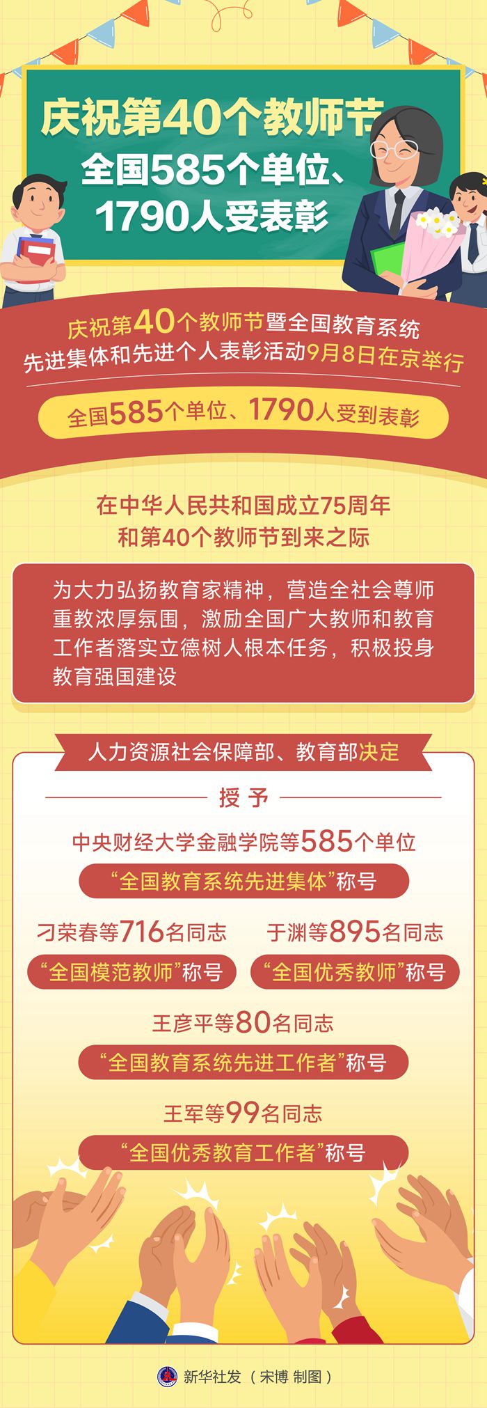 新華社北京9月8日電 慶祝第40個教師節暨全國教育系統先進集體和先進個人表彰活動8日在京舉行。全國585個單位、1790人受到表彰。