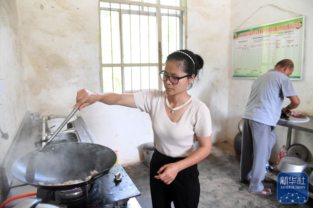 在廣西都安瑤族自治縣龍灣鄉(xiāng)琴棋小學(xué),“85后”老師藍(lán)巧春(左)在給學(xué)生做午飯(2017年8月31日攝)。