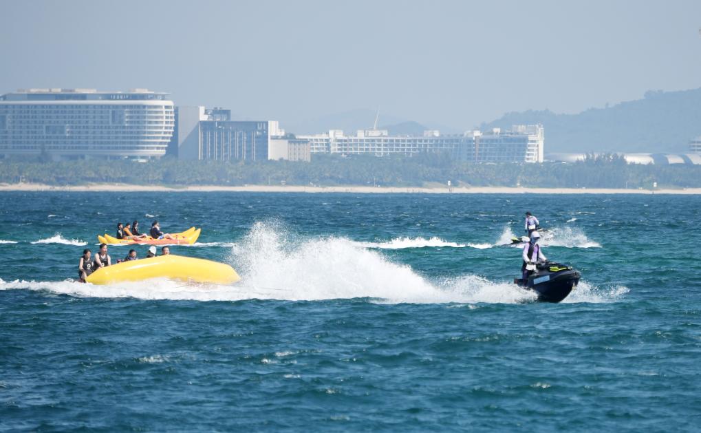 10月4日,在海南三亞蜈支洲島旅游區(qū),游客體驗海上項目。新華社記者趙穎全 攝
