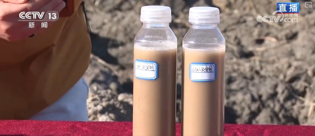 這片田采用的是有機硅改良劑來治理的鹽堿地,選取同地塊的鹽堿土溶于水中,加入有機硅后,土壤和水快速分層。可以看到,有機硅具有較強的親土性,可以和土壤包裹一起,阻斷鹽分吸收,從而達到降堿和改變土壤板結的作用。這能讓水稻更好地扎根生長,渾濁的水變清澈,也可以增加作物的光合作用,有效治理重度鹽堿土壤。