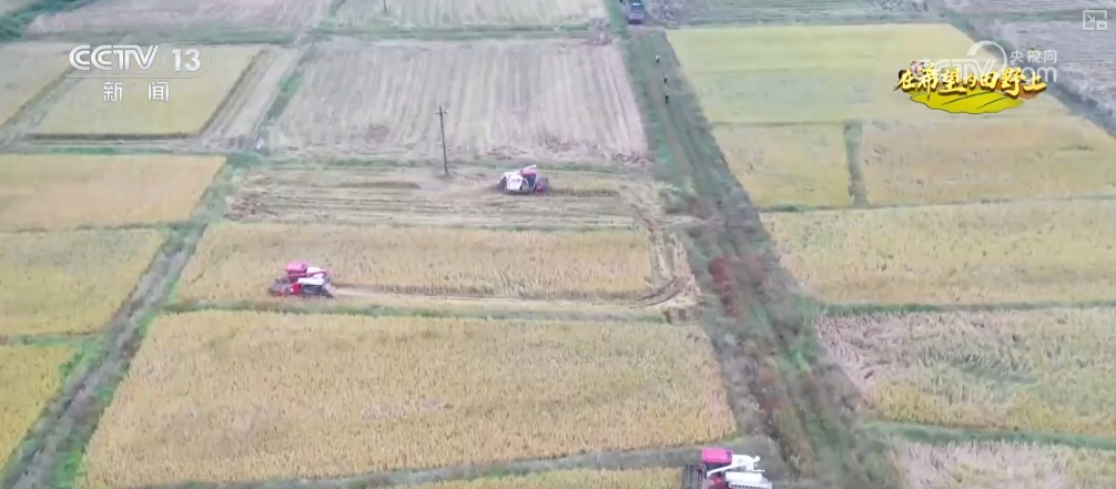 在江西宜春,多臺大型收割機在農田里全程機械化作業,搶收秋糧,確保顆粒歸倉。