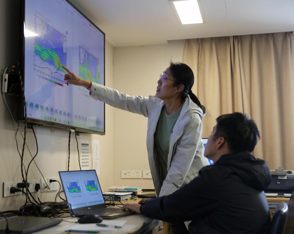 執行中國第41次南極考察任務的“雪龍”號和“雪龍2”號于北京時間2024年11月19日開始穿越“咆哮”西風帶。這是“雪龍2”號隨船氣象保障員劉素芳(左)在研判天氣情況,規劃航行路線。新華社記者黃韜銘攝