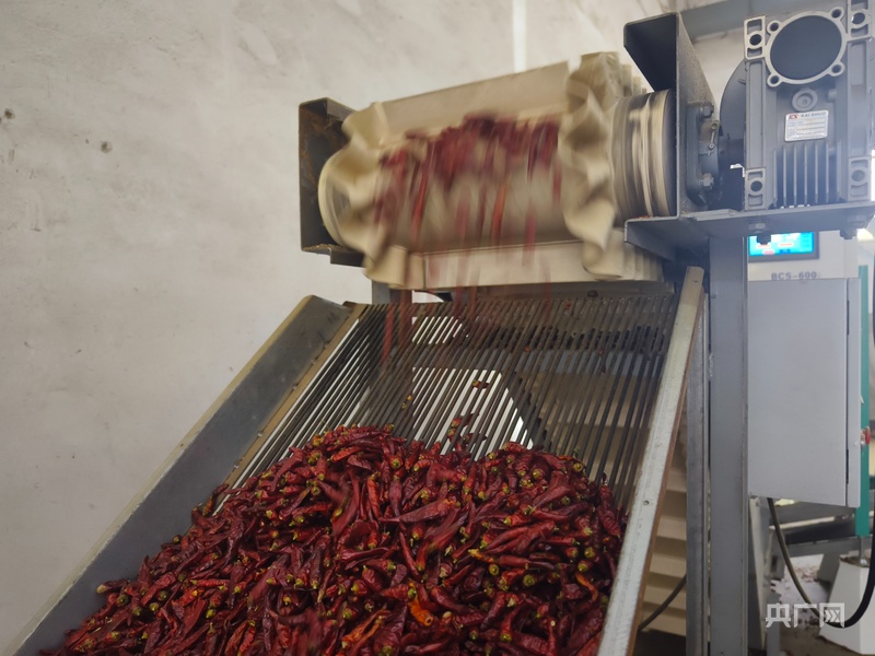 生產(chǎn)車(chē)間內(nèi)辣椒正在進(jìn)行機(jī)械化處理(央廣網(wǎng)記者 欒小琳 攝)