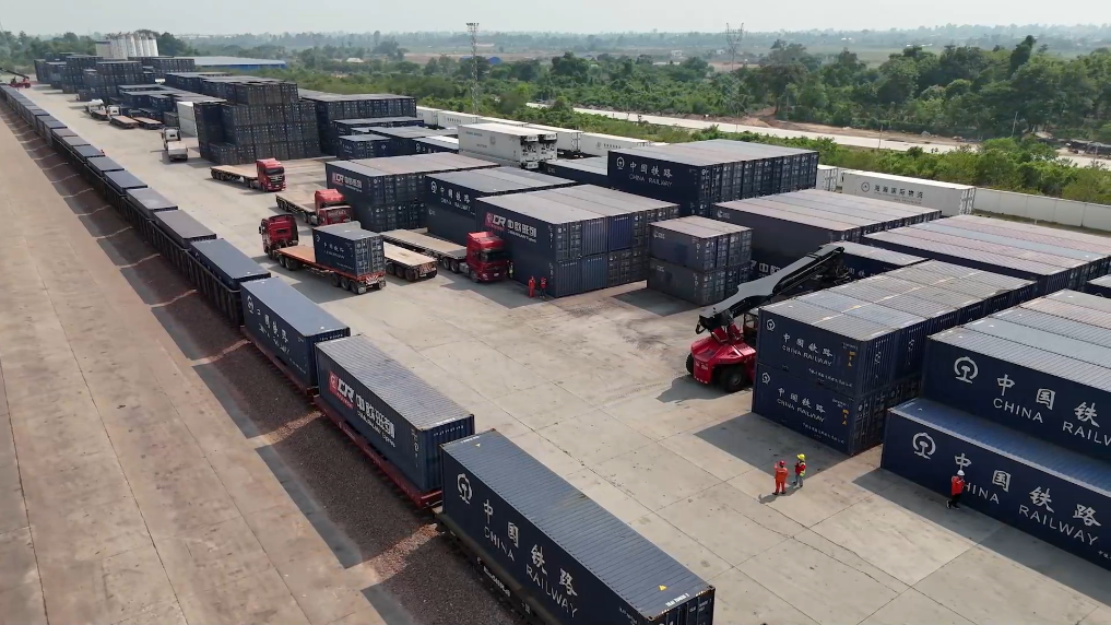 在中老鐵路萬象南站換裝場,一派繁忙而有序的景象映入眼簾。滿載泰國榴蓮、龍眼等貨物的集裝箱被穩穩吊裝上開往中國的中老鐵路“瀾湄快線”列車,裝有中國啤酒、藥膏等貨物的集裝箱則啟程前往泰國。