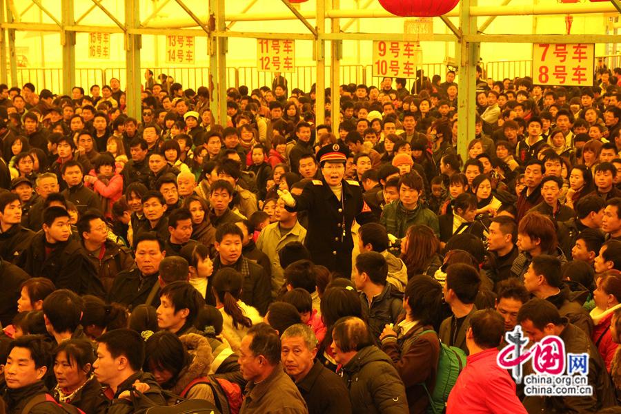 2025年春運期間 ,南昌站工作人員為旅客指引候車位置。中國網發 劉慕/攝