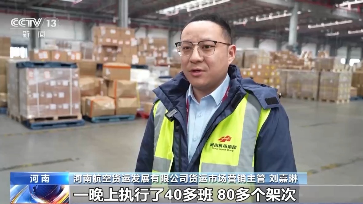 河南航空貨運發展有限公司貨運市場營銷主管 劉嘉琳:最繁忙的時候,一晚上執行了40多班,80多個架次。每一個環節、每個時間節點我們都有監控,哪個節點出現問題了,耽擱的時間比較長了,后臺對現場進行提醒。高峰期加派人員,大大提高了作業效率。