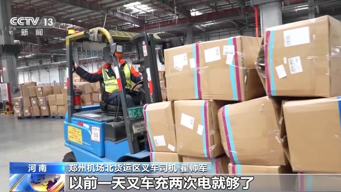 鄭州機場北貨運區叉車司機 翟帥軍:飛機航班多不多,裝得滿不滿,看我這邊就知道,以前一天叉車充兩次電就夠了,現在要充四次電。