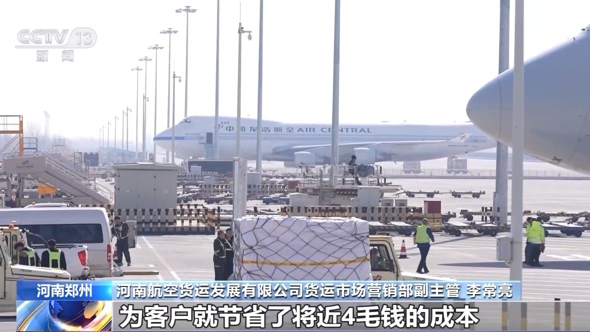 河南航空貨運發展有限公司貨運市場營銷部 李常亮:時效能夠提升3到6個小時,而且我們現在對中轉貨實行一次性收費,算下來相當于我們一公斤為客戶就節省了將近4毛錢的成本。
