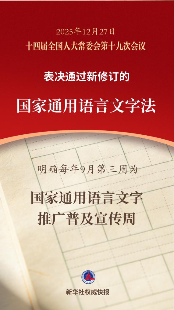 十四屆全國(guó)人大常委會(huì)第十九次會(huì)議12月27日表決通過(guò)新修訂的國(guó)家通用語(yǔ)言文字法,明確每年9月的第三周為國(guó)家通用語(yǔ)言文字推廣普及宣傳周。