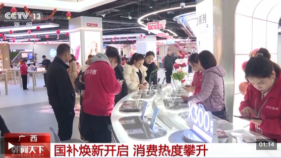 柳州、貴港是廣西今年首批啟動消費品以舊換新補貼活動的城市,消費者在指定商家購買家電、數碼和智能產品可享受補貼直接減免,政策紅利精準激活消費活力。