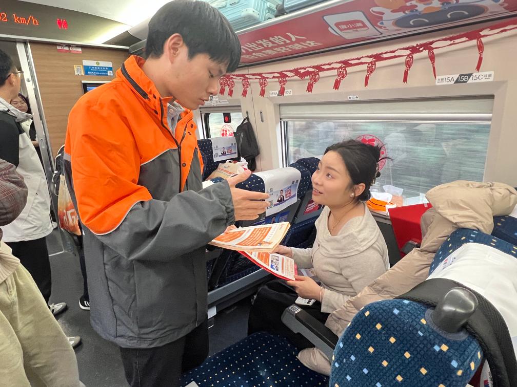 2月7日,G1136次列車上,湖北荊門的企業(yè)招聘專員向返鄉(xiāng)人員介紹企業(yè)招聘情況。(受訪者供圖)
