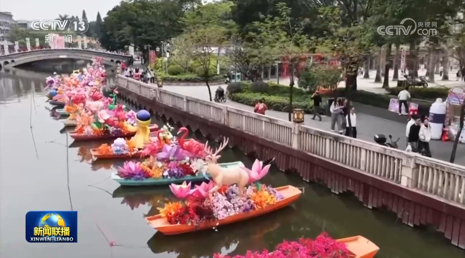 在廣東佛山南海里水鎮,嶺南新春水上花市開啟。龍舟花舫、七彩花艇滿載著鮮花,穿梭在河道之上。今年的水上花市還打造近30組水陸花燈,讓人們沉浸式體驗嶺南水鄉的年味。
