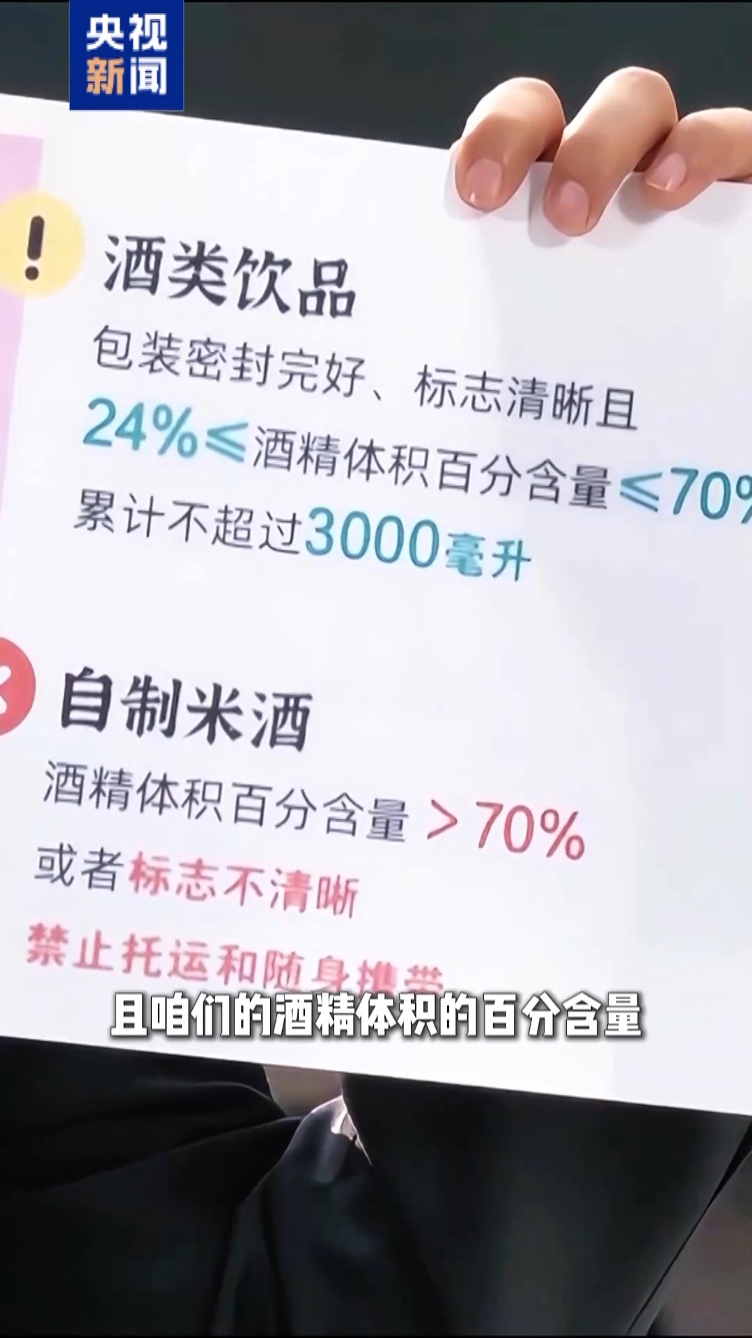 國鐵沈陽局長春客運段列車長 劉影:酒能帶,但是有幾個前提,首先包裝要完好,而且標志清晰,酒精體積的百分含量在24%和70%之間,總攜帶量不要超過3000毫升。