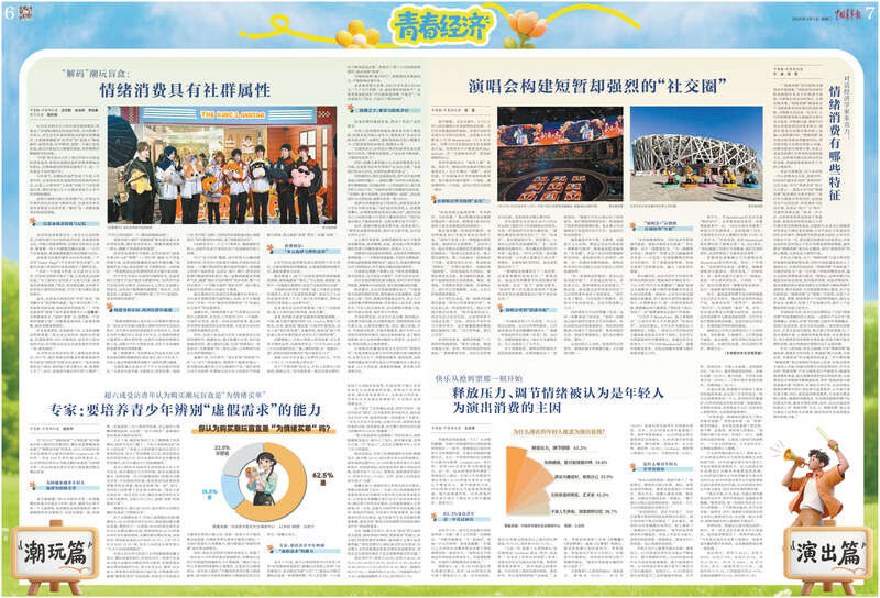 消費端彰顯“青春經(jīng)濟”活力。青年消費者追求的不再是單一產(chǎn)品,而是更加注重情感共鳴、文化認同和價值表達,由“性價比”轉向“心價比”。中青報及中青校媒記者調(diào)研發(fā)現(xiàn),61.2%的受訪青年會為了釋放壓力、調(diào)節(jié)情緒而為演出花錢,62.5%的受訪青年認為購買潮玩盲盒是在為情緒買單。國研新經(jīng)濟研究院創(chuàng)始院長朱克力認為,年輕一代的消費正變得越來越多元化、個性化,充滿文化感、設計感和科技感。“這些特性與社會躍遷密切相關。”