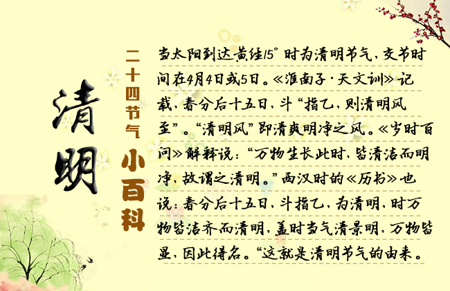節選自《二十四節氣志》/宋英杰 4月5日前后為清明節氣,氣清景明之意,正是鳥語花香的盛春時節?!把匀f物去故而從新,莫不鮮明之謂也?!薄叭f物生長此時,皆清凈明潔,故謂之清明?!鼻迕髦?,便表征了這一時節的天氣是清新、明媚、和暖的。