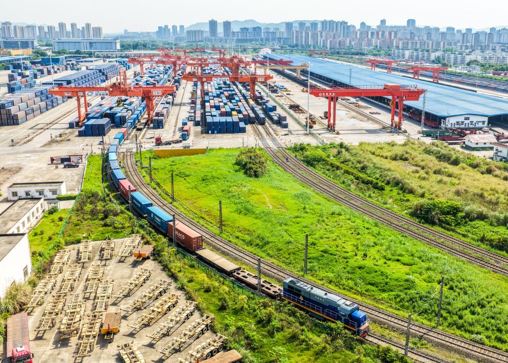 4月23日,一列裝載汽車配件、機械機具等貨物的中歐班列在重慶團結村站順利發車(無人機照片)。新華社記者 唐奕 攝