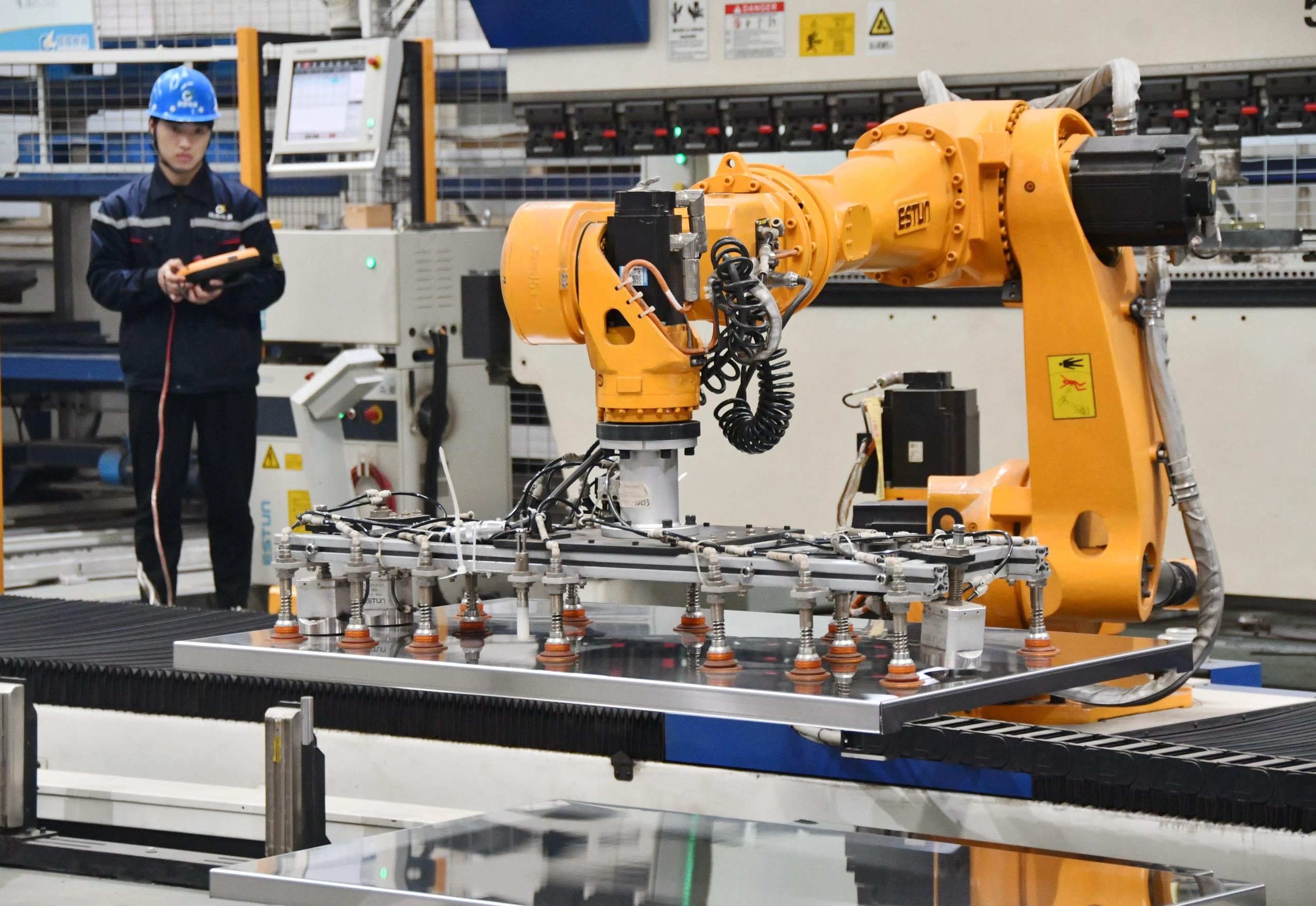 2025年2月21日,河北邯鄲永年區工業園區的一家企業,工人正在操控工業機器人作業。
