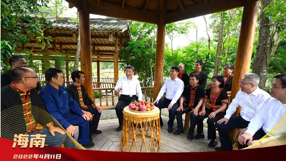 2022年4月,總書記來到海南五指山市水滿鄉毛納村考察調研。村寨涼亭里,鄉親們正議農事。