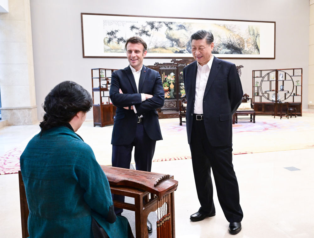 2023年4月7日,國家主席習近平在廣東省廣州市松園同法國總統馬克龍舉行非正式會晤。這是兩國元首在白云廳欣賞古琴演奏。新華社記者 岳月偉 攝