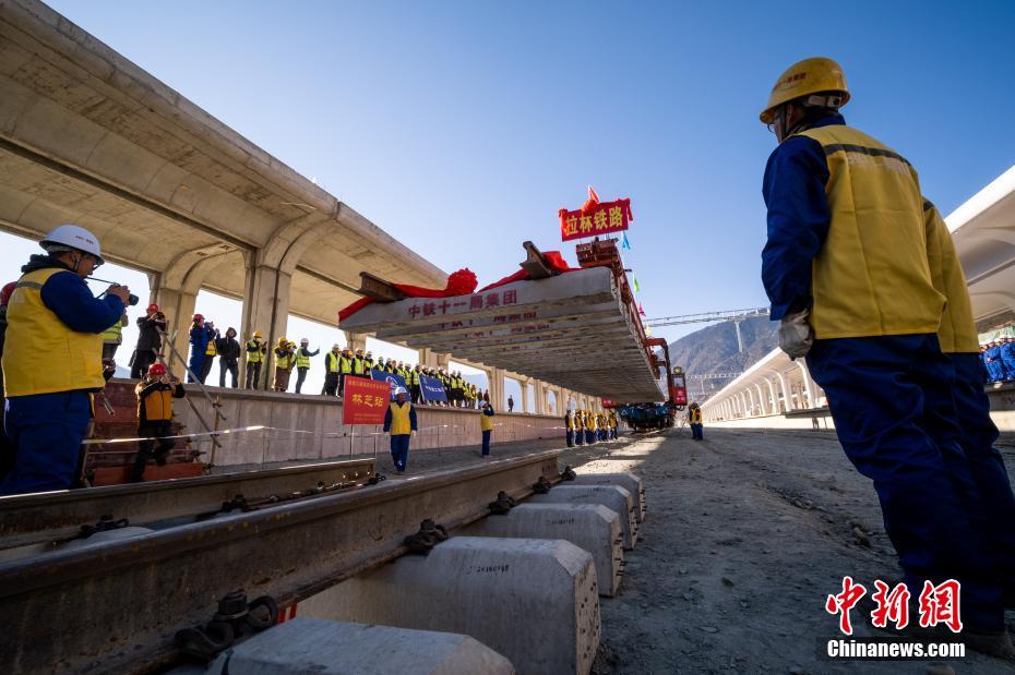 12月31日,拉林鐵路最后一段軌排鋪設現場。當日,在西藏林芝市尼洋河畔的新建林芝火車站,川藏鐵路拉薩至林芝段(拉林鐵路)最后一段軌排順利鋪設,這標志著拉林鐵路399.61公里的正線軌道全部鋪通,西藏東南地區結束無鐵路歷史。拉林鐵路起自西藏自治區首府拉薩,終點為林芝市,正線全長435.5公里,新建正線403.1公里,系西藏首條電氣化鐵路,設計行車速度為160km/h,全線計劃于2021年6月30日建成通車。中新社記者 何蓬磊 攝