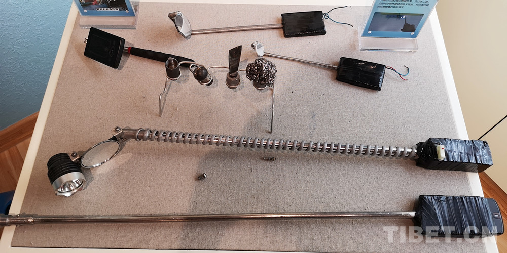 圖為楊永磊設計的管道內熔渣挖取工具(圖上部三個)、焊縫外觀檢查工具(圖下部兩個),前者能以鏟、掃、粘或吸的方式將管道內熔渣清理干凈,后者以燈照亮焊縫倒映于鏡面,便于觀察刁鉆位置焊縫的實際情況 攝影:李元梅