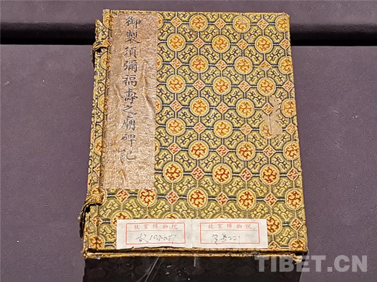 乾隆為迎接六世班禪的到來,特于承德避暑山莊北面獅子溝南坡,仿日喀則扎什倫布寺,建造須彌福壽之廟供六世班禪講經和居住。此書冊記錄了這一歷史。書冊經折裝,上下面板裱織錦,全冊選用磁青紙以金汁書寫。扉頁、拖尾頁分別繪釋迦牟尼佛及韋陀,畫風為典型乾隆宮廷風格。正文以纏枝花卉紋為框,烏絲欄,一開十行。