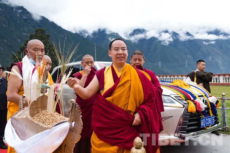 9月2日,山間云霧還未散去,寺院僧人早已整齊列隊,高舉幡幢,手持香爐、法號,恭迎全國政協常委、中國佛教協會副會長、中國佛教協會西藏分會會長班禪額爾德尼?確吉杰布的到來。