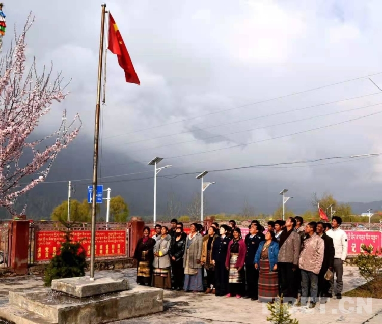 圖為稅收干部和當地群眾在西藏自治區日喀則市吉隆鎮達曼村開展升國旗儀式