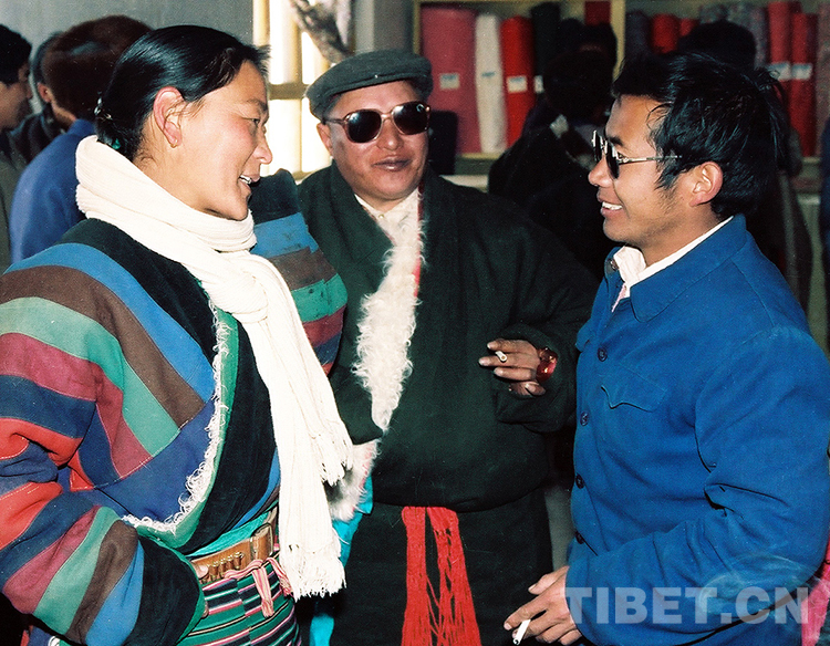 這是文部辦事處主任加央多吉(右)與參加那曲地區基層政權建設工作現場會的那曲縣縣長嘎瑪(左)在交流(唐召明1989年12月份攝)