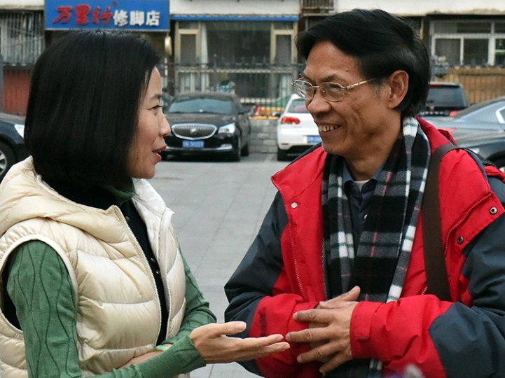 這是黃綿瑾(右)與中國評劇院院長侯紅(左)就評劇藝術進行交流(唐召明2017年11月26日攝)